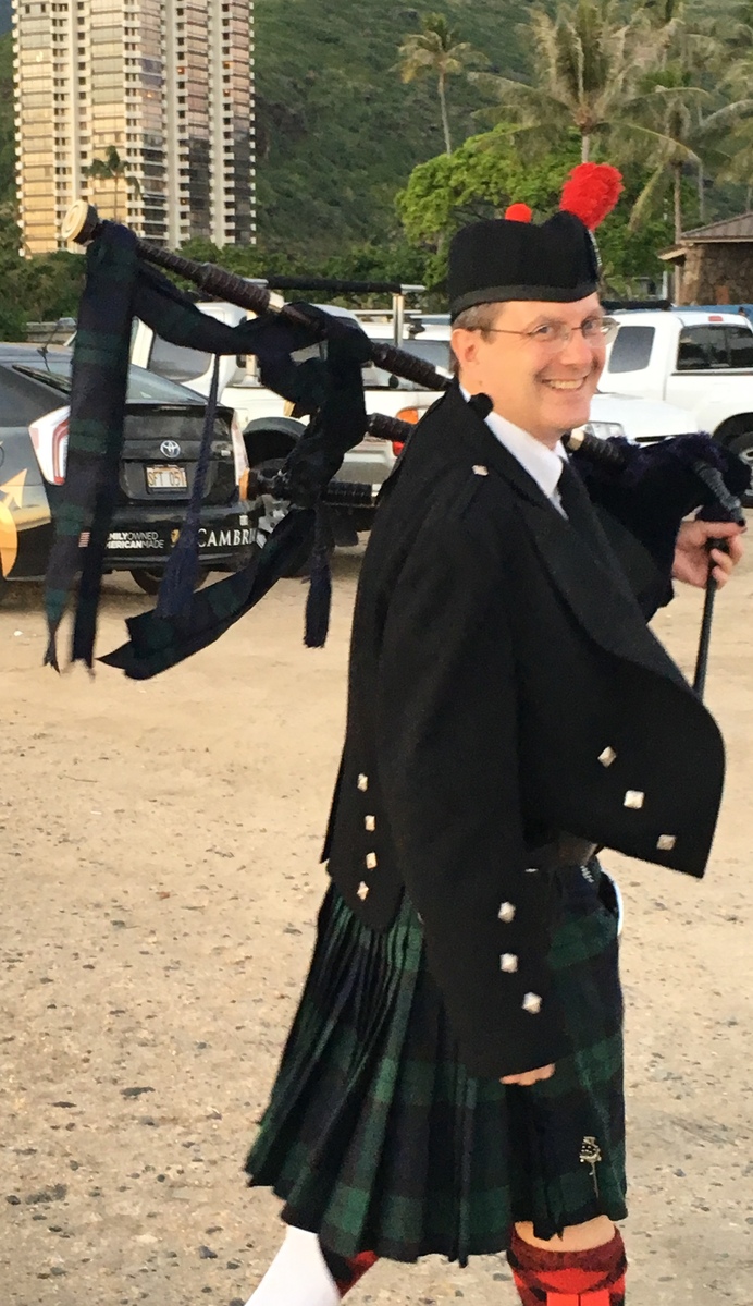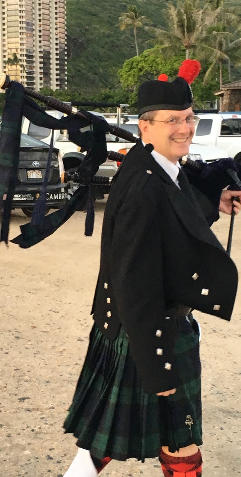 I have now been playing bagpipes for over a dozen years, first in the Washington DC area where I studied with Grade 1 piper and City of Alexandria Pipe Major, John Sprague, then in Honolulu for the past ten years, initially playing with the Celtic Pipes and Drums of Hawaii under Piper Major Dan Quinn, followed by piping as a solo piper and currently with the Isle of Maui Pipe Band. Over that time, I have performed as a solo piper for many events including weddings, church services, funerals, memorial services, and birthdays. I have even piped for ash scatterings on board a sailboat at sea and on an outrigger canoe! In 2022, I was honored to lead a small ensemble in piping for Queen Elizabeth's 75th Jubilee Celebration at 'Iolani Palace.